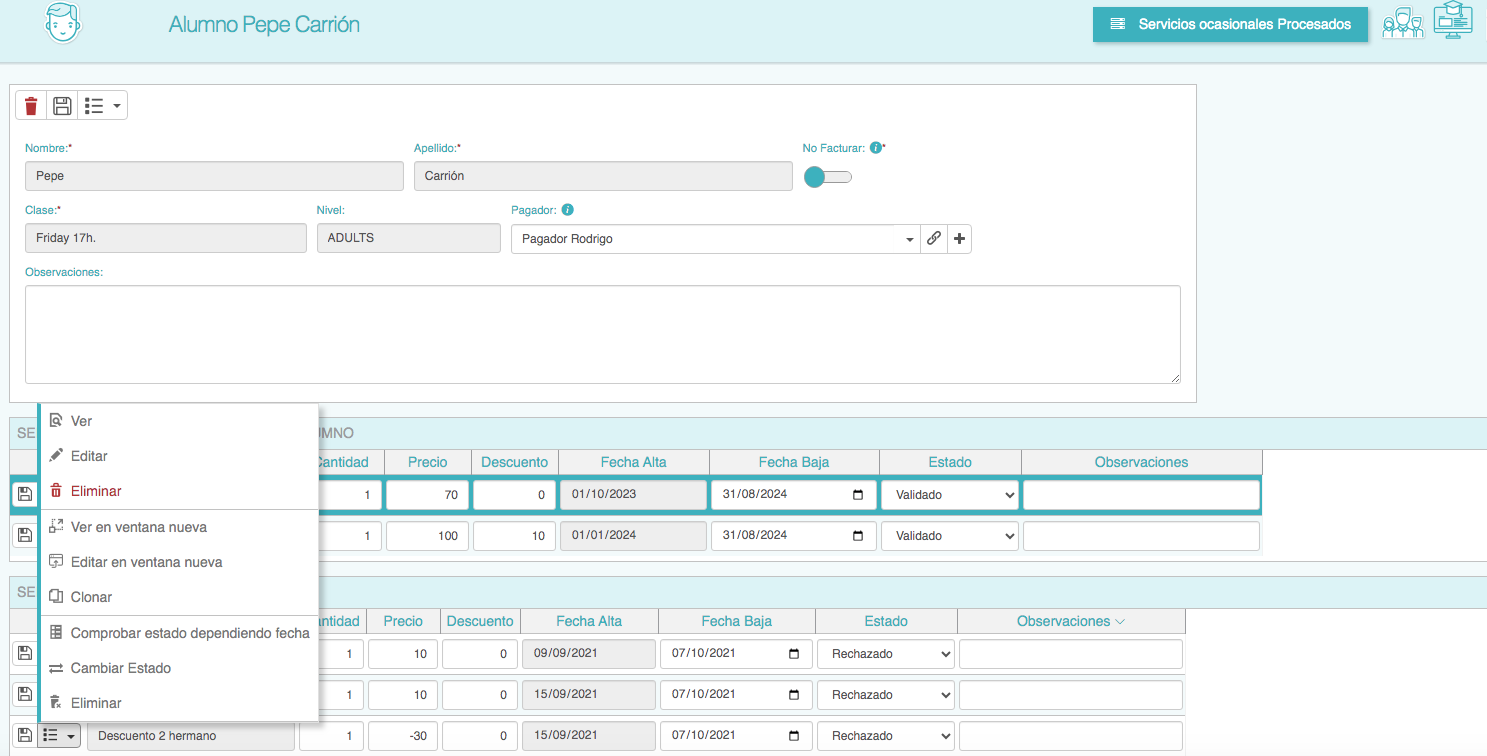 Para ello podemos editar sobre la línea del servicio que aparece en la ficha del alumno: